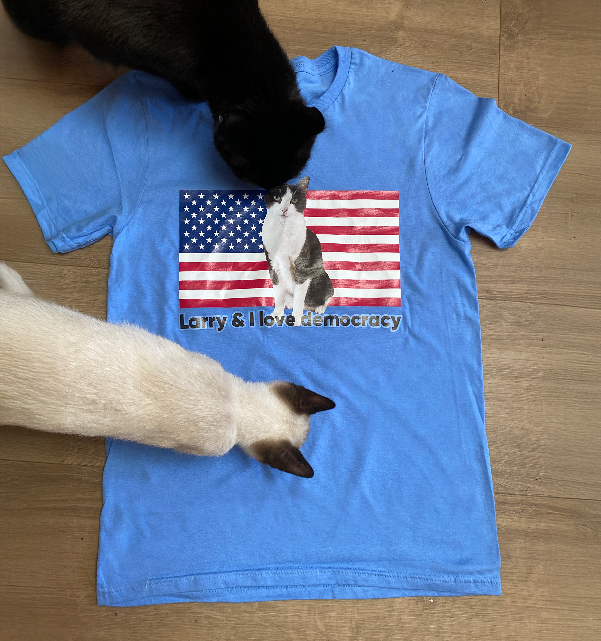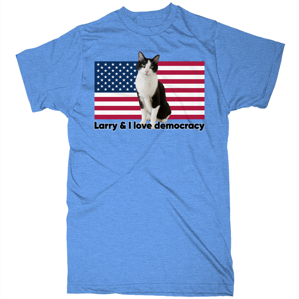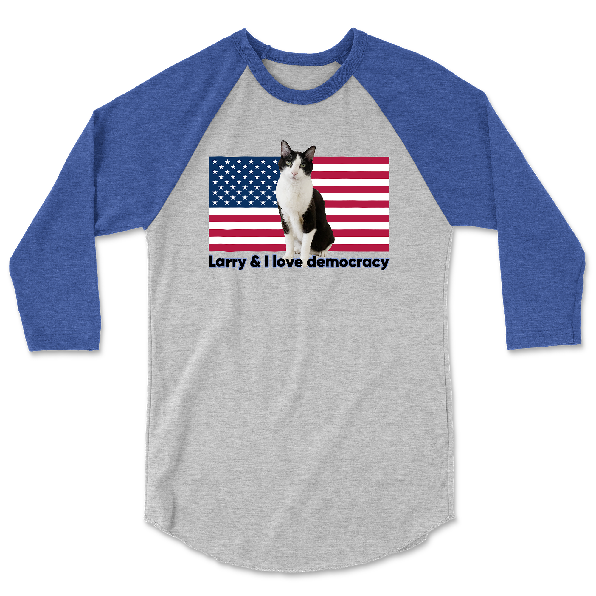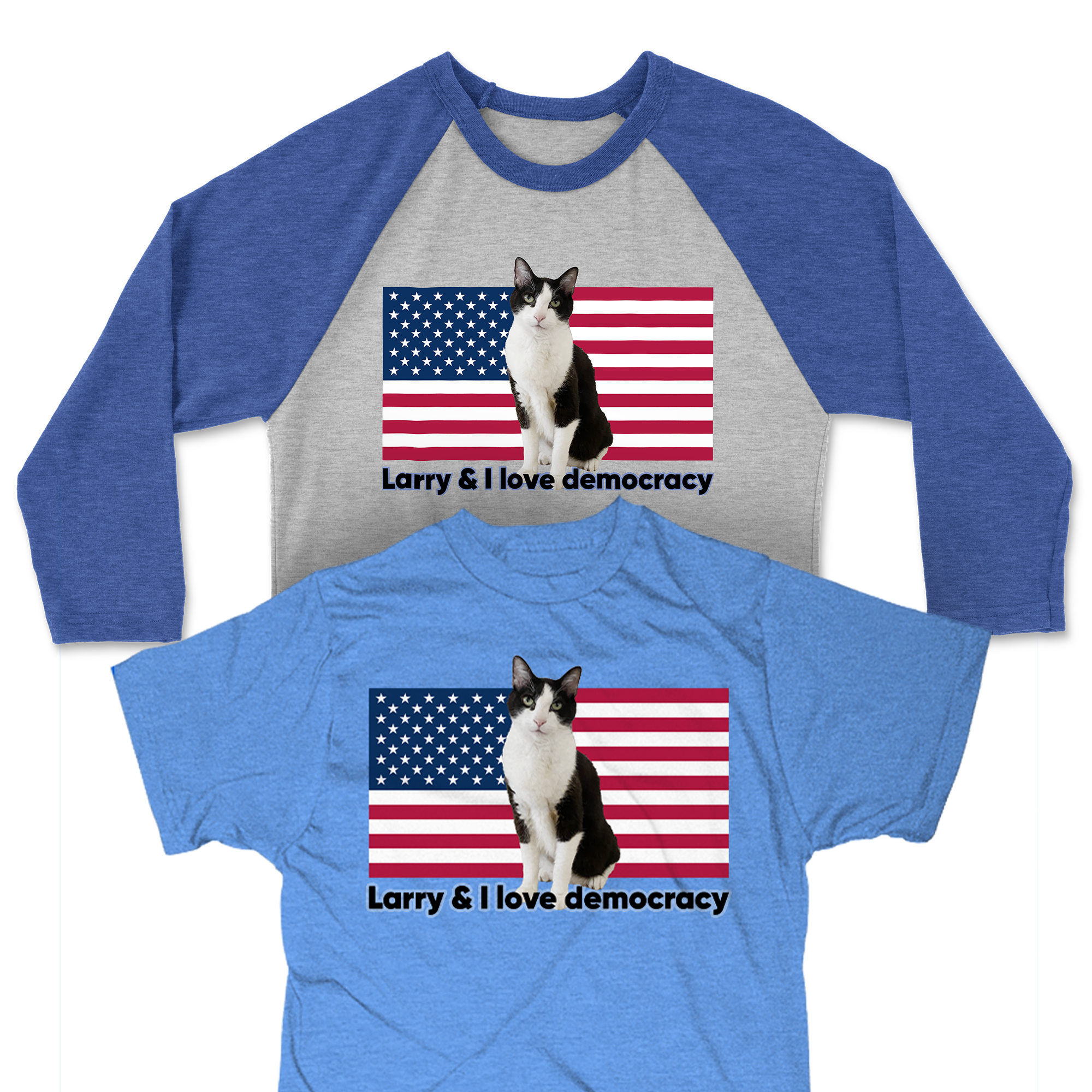 “Larry & I love democracy” tee, in short sleeve or baseball raglan style with PaulaPoundstone.com on the back.